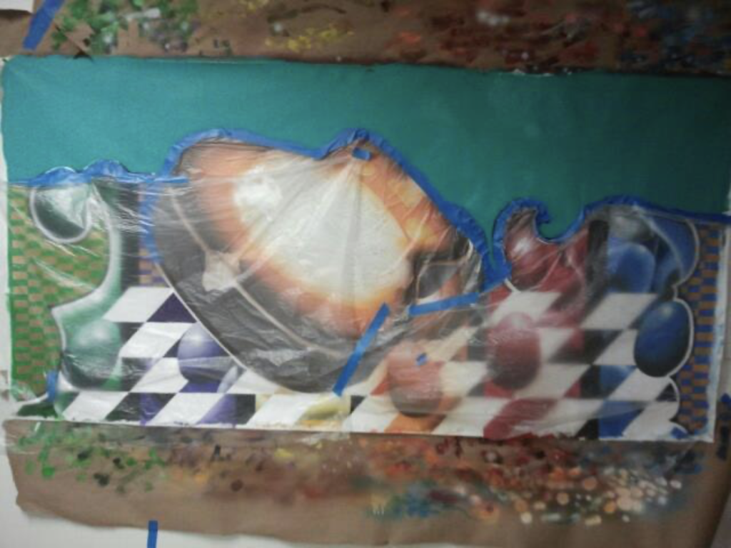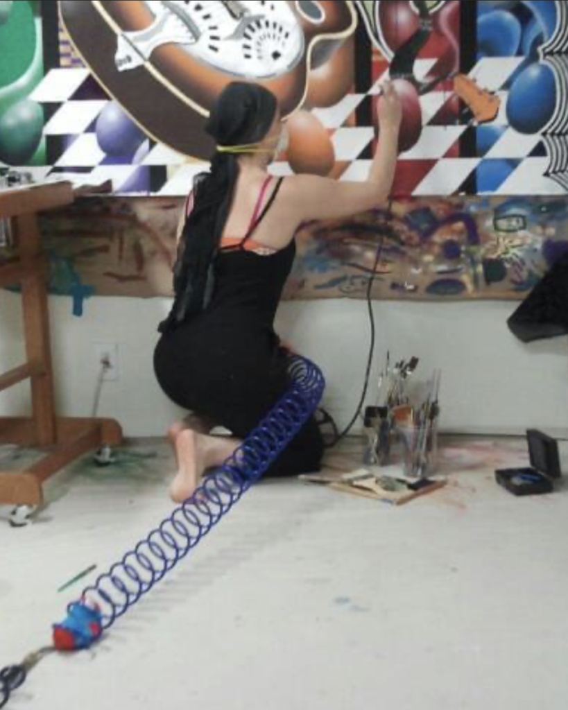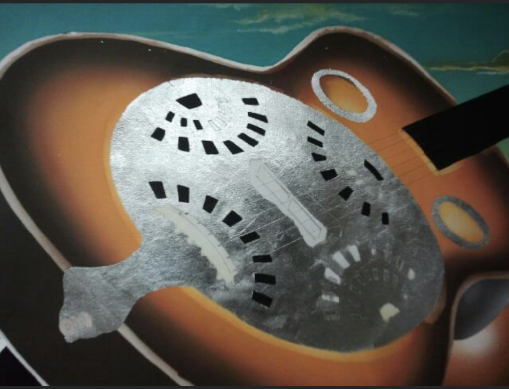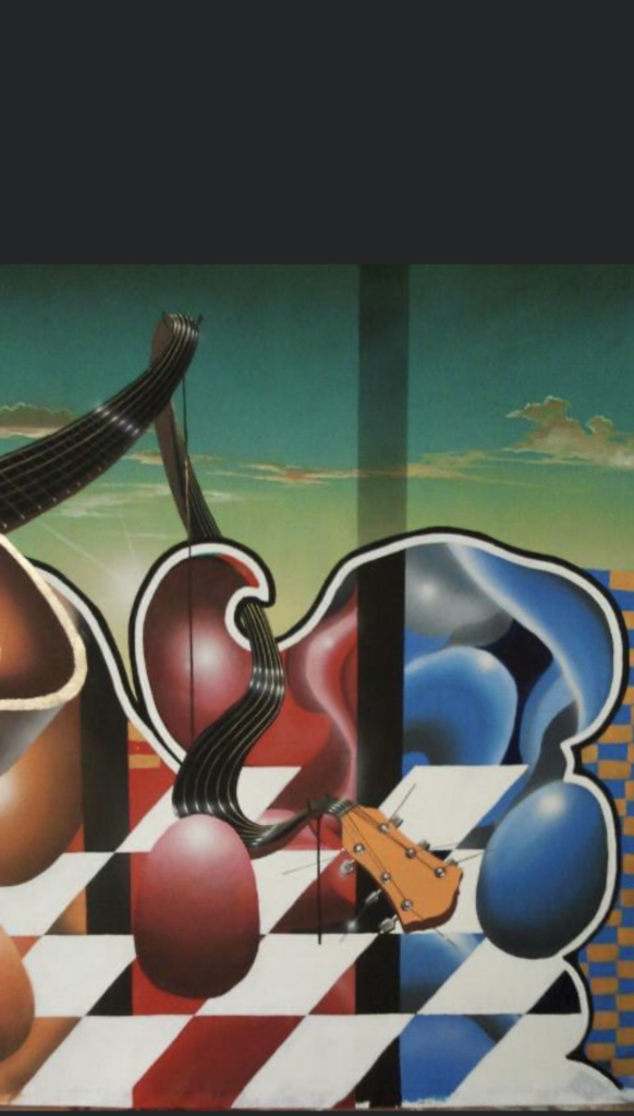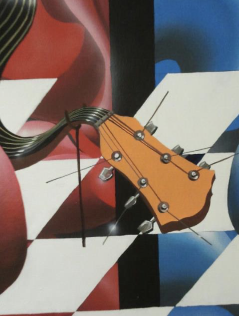 “This artwork features a surreal electric guitar, floating inside an egg, with its metallic parts covered in white gold leaf. Giant, colorful eggs surround the scene, creating a vivid and imaginative painting full of energy and unique style.”